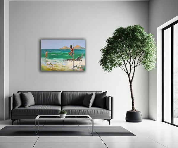 • "This painting captures one of the most iconic and authentic traditions of Sri Lanka — stilt fishing. The scene is both timeless and symbolic: a dialogue between humans and the sea, between patience and movement, between culture and nature. The expressive brushstrokes and vibrant colors reflect the energy of the ocean waves, while the calm posture of the fishermen conveys a deep connection to tradition and place." Henadzy