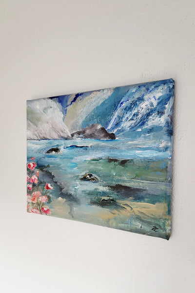 Malet på kanterne, og ser perfekt ud uden ramme omkring.