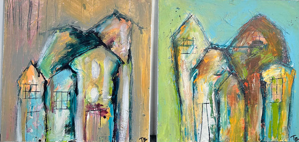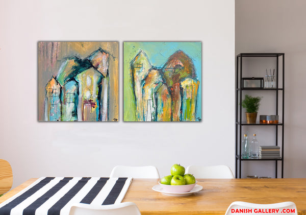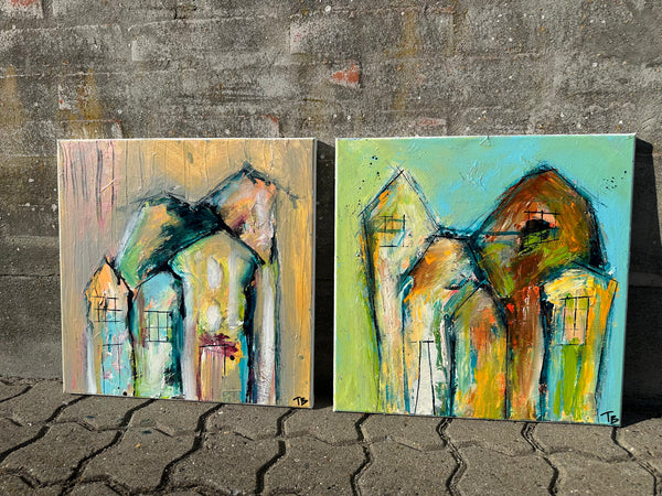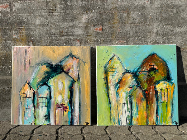 - Sæt med to malerier der hver måler 40x40cm.