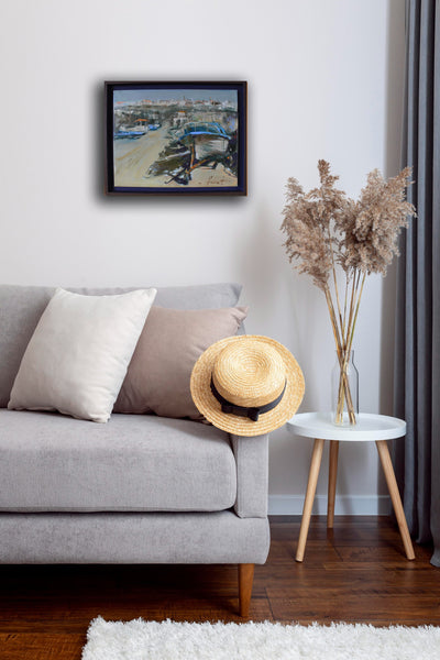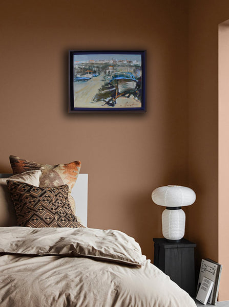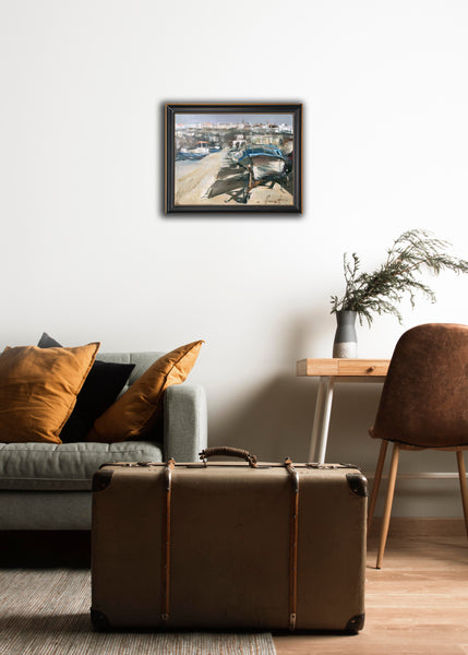 - "An old boat resting on the shore, like a hero who has stepped off the stage, bears traces of past storms and sea roads. Its worn hull in shades of blue and white contrasts with the soft dust of the pier. The blurred outlines of port life in the background give the composition a sense of silence and memory. This is a moment of rest, but not oblivion - the boat is waiting for its time." Henadzy