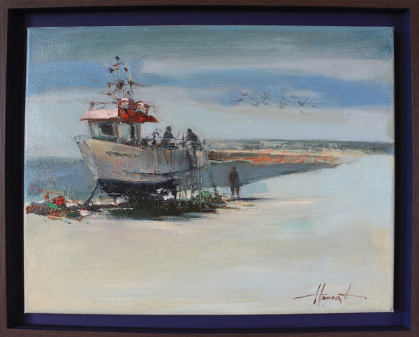 On the pier, near the launch, there are figures of people, as if in dialogue with the sea and time. This is a moment of silent connection between man, land and boat - that which connects everyday life and dreams, work and silence." Henadzy